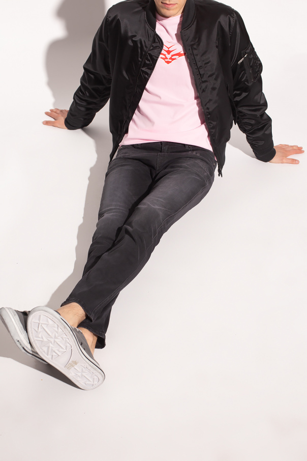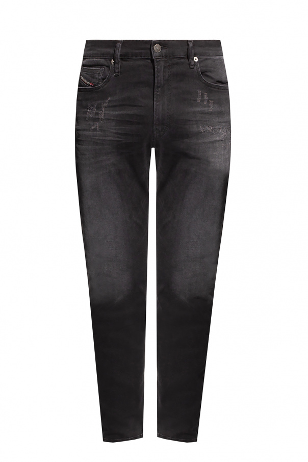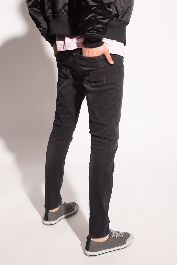 Dark grey \'D-Istort\' jeans from Diesel. Crafted from cotton with distressed effects, this pair falls down with tapered legs and features a zip fly with a button, classic five pockets and a black leather patch with an embossed logo at the back.