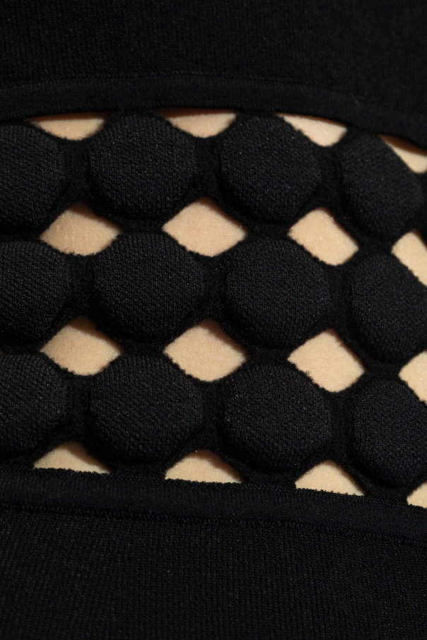 Introducing the epitome of sophistication and modern elegance, the Alaïa Mid-Length Dress with Cut-Outs. Crafted with meticulous attention to detail, this dress is designed for the woman who appreciates the blend of contemporary style and timeless grace. The dominant black hue enhances its versatility and allure, making it an impeccable choice for various occasions. The dress\'s form-fitting silhouette extends gracefully to the knees, featuring a refined turtleneck that adds a touch of formal elegance. Its distinguishing feature, the honeycomb-like cut-outs filled with semi-spherical inserts, creates a captivating three-dimensional effect that is both innovative and visually stunning. Made from a smooth and stretchy fabric blend, including viscose and polyester, it promises both comfort and a flattering fit, adapting seamlessly to your silhouette. Each detail, from the unique waist cut-outs to the quality of the material, has been crafted with precision, highlighting the dress\'s exceptional craftsmanship and the designer\'s commitment to luxury and design excellence. Why Purchase This Dress? Elegance Redefined: The sophisticated turtleneck and knee-length design ensure a timeless appeal. Unique Design Elements: Honeycomb-like cut-outs offer a distinctive aesthetic that sets this dress apart. Supreme Comfort: A blend of viscose and polyester provides stretch and softness for all-day wear. Masterful Craftsmanship: Impeccable attention to detail and quality, characteristic of Alaïa\'s renowned designs.