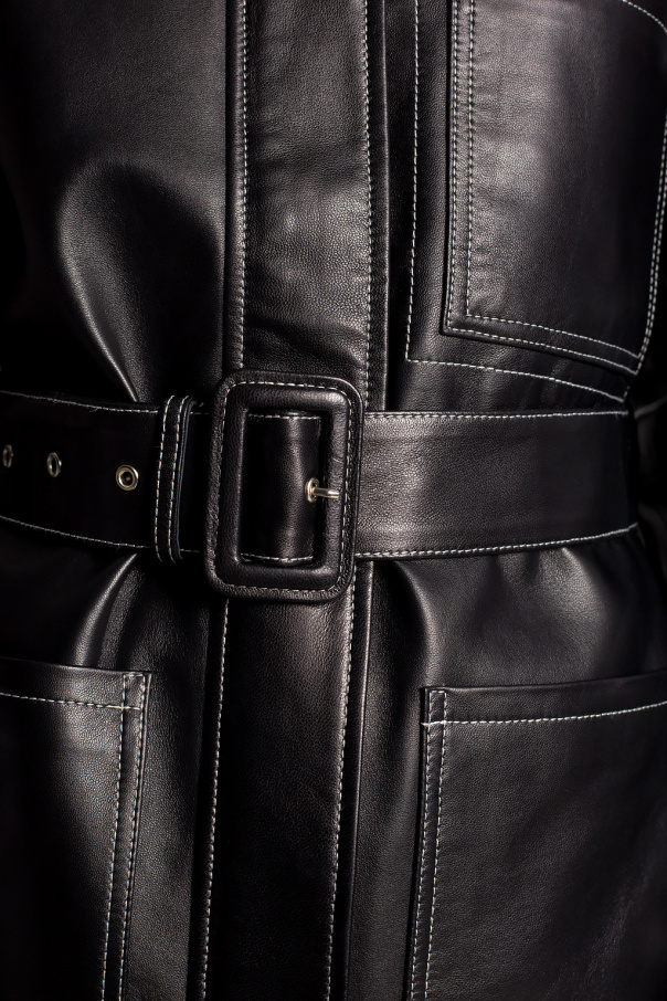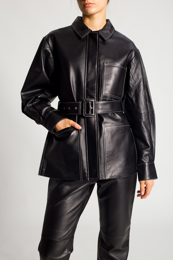 Black jacket from Proenza Schouler White Label. Crafted from sheepskin, this style fastens via a zip and snaps and showcases distinctive stitching details, a waist-cinching buckle belt, three slip pockets, side slits and long sleeves with snap closures on the cuffs.