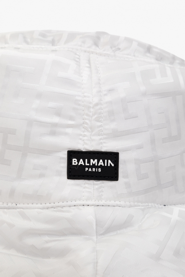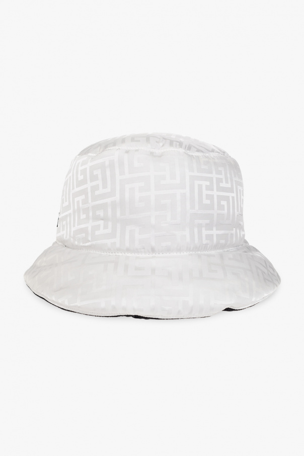 Reversible black and white bucket hat with a monogram pattern and logo patch from Balmain.