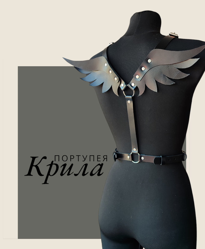 Портупея с крыльями из натуральной кожи выполнена в ширине ремешка 2 см с фурнитурой цвета никель. Регулируется с помощью шлеек на плечах и по бокам на талии.