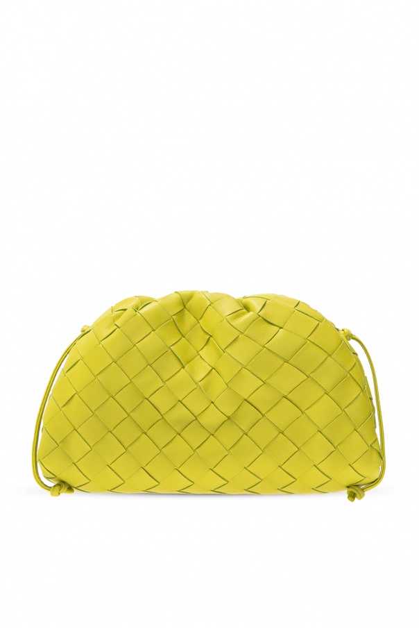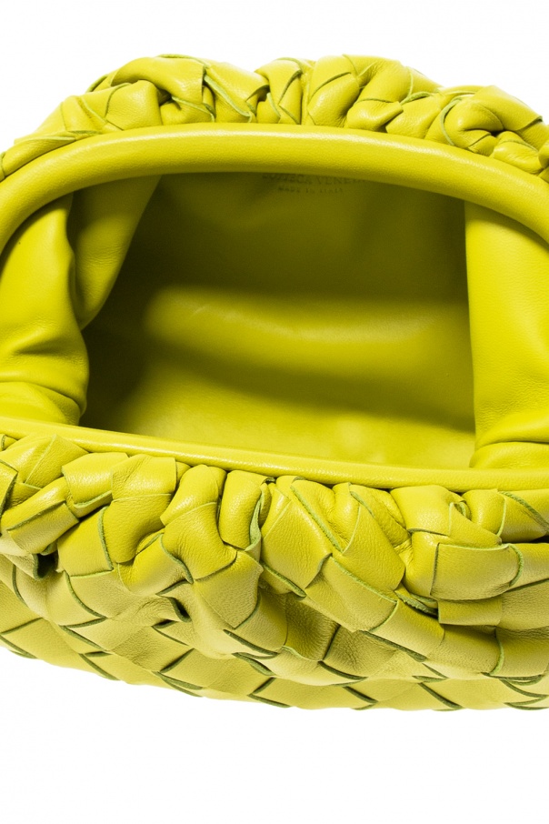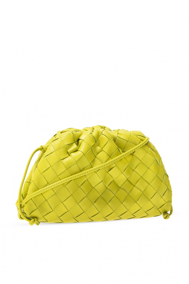 Green ‘The Mini Pouch’ shoulder bag from Bottega Veneta. Crafted from lamb leather with the iconic Intrecciato weave, this style is complete with a magnetic snap fastening, decorative gathers, leather shoulder strap and one internal compartment.