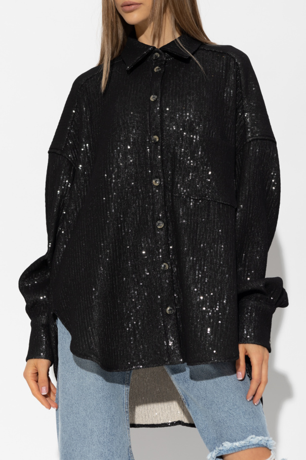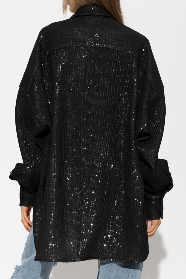 Black ‘Bilbao’ shirt from The Mannei. Covered with glossy sequins and silk details, this style features an oversize fit, button fastenings, a slip front pocket, dropped shoulder and long sleeves with button cuffs.