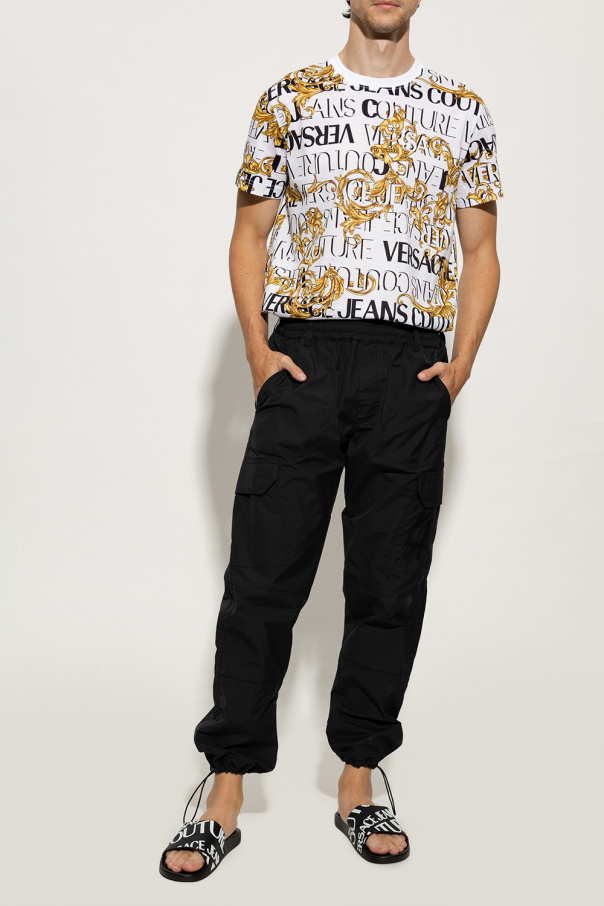 Black slides with a raised logo in white from Versace Jeans Couture. Made of rubber.
