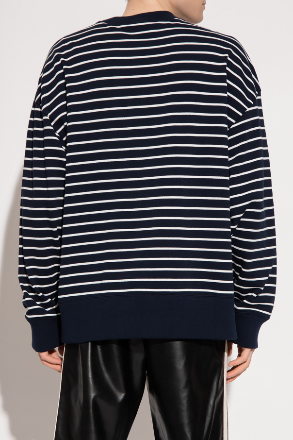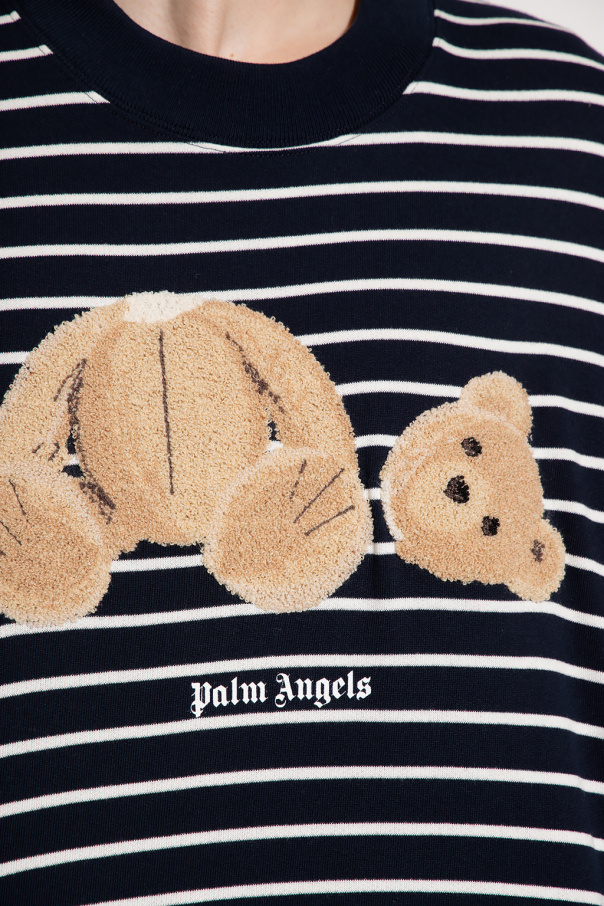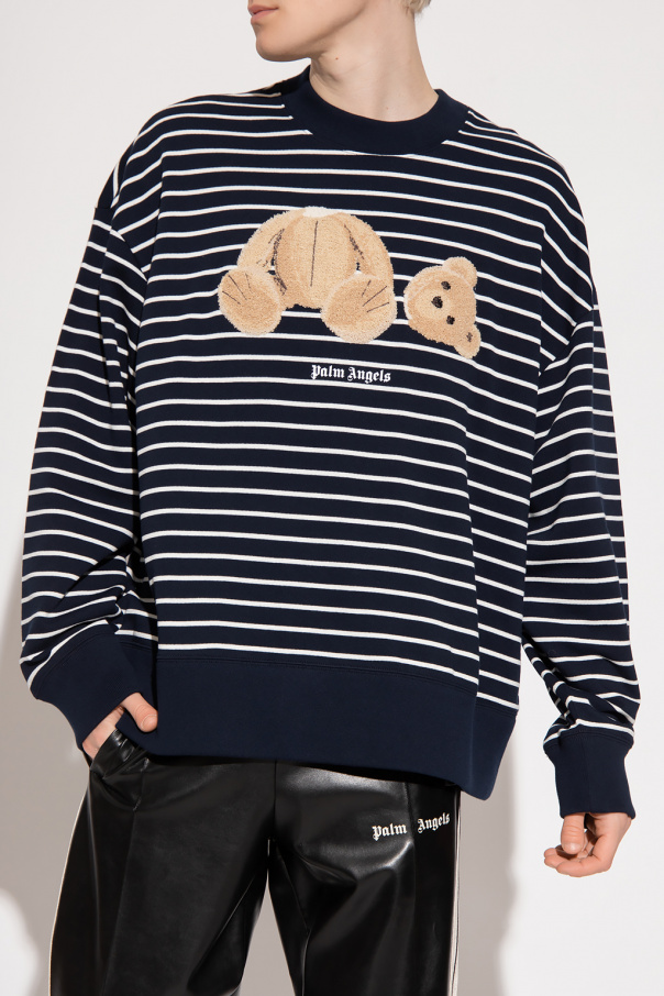 Navy and white crewneck sweatshirt from Palm Angels. Made of cotton, this long sleeve design features a stripe pattern, the label’s signature teddy bear motif, white logo print and ribbed trims at the hem and cuffs.