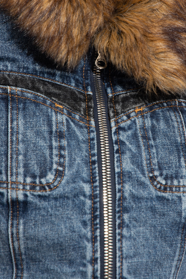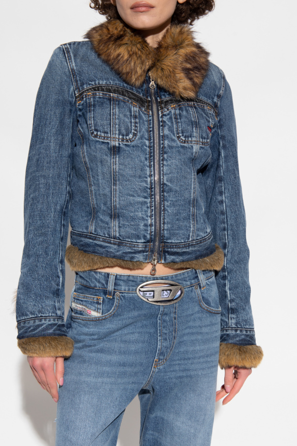 Blue ‘DE-SIMMY’ padded denim jacket from Diesel. Crafted with a tailored fit, this style fastens with a two-way zipper and features two slip pockets accompanied with red logo embroidery on the front, brown faux fur trims on the collar, bottom and cuffs and long sleeves with button cuffs.