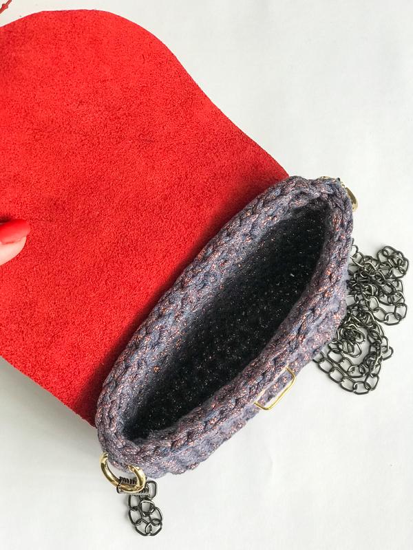 Мини сумочка, из трикотажной пряжи, клапан из натуральной кожи. Размер: высота 12 см, глубина 6 см, ширина 14 см.