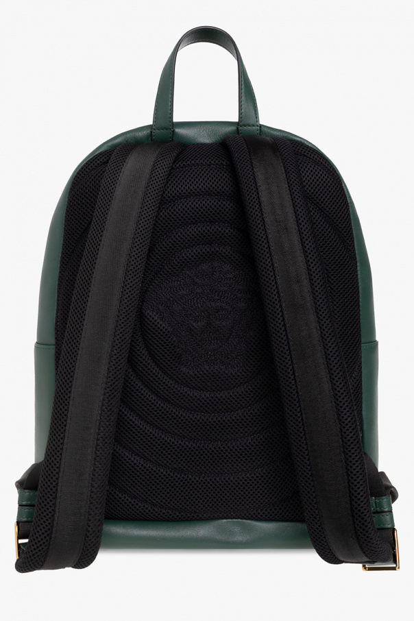 Dark green ‘Medusa Biggie’ backpack from Versace. Crafted from calf leather, this design secures with a two-way zipper and showcases a metal Medusa plaque accompanied by a logo patch and a zip pocket on the front, a top handle, adjustable shoulder straps, gold-tone metal hardware and one internal compartment with one slip pocket and one zip pocket.