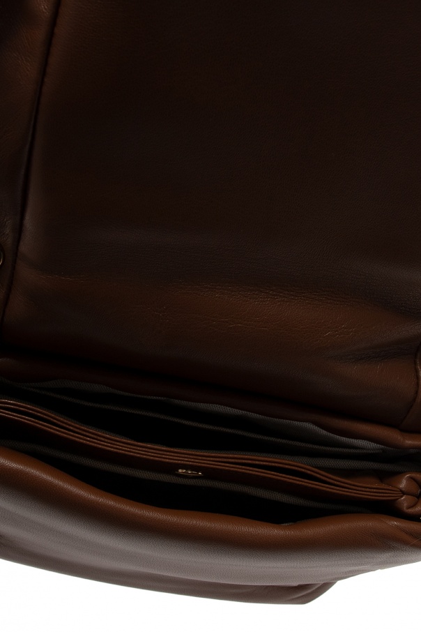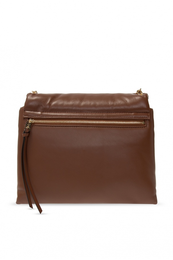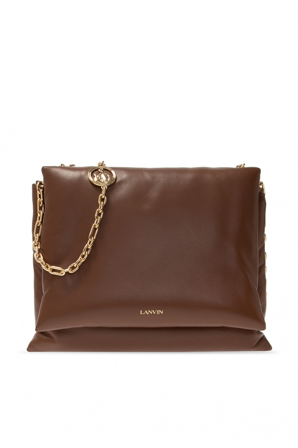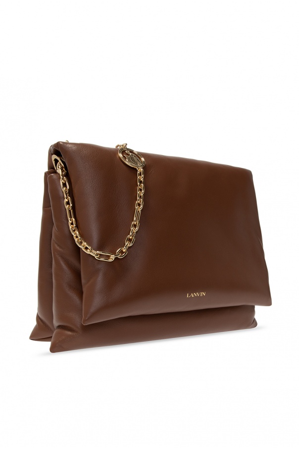 Brown ‘Sugar’ shoulder bag from Lanvin. Size small. Crafted from lamb leather, this design fastens via magnetic snap-buttons and showcases a gold-tone logo embossed on the front. An adjustable shoulder strap reinforced with chain, gold-tone metal fittings and interior with two compartments, one slip pocket and one snap-fastened pocket complete the look.