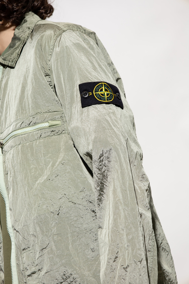 Green jacket from Stone Island. Crafted from glossy material with a crease effect, this style fastens with a two-way zipper and features a zip pocket on the front and long sleeves – one is accentuated with a detachable logo patch.