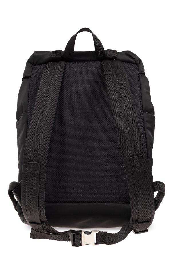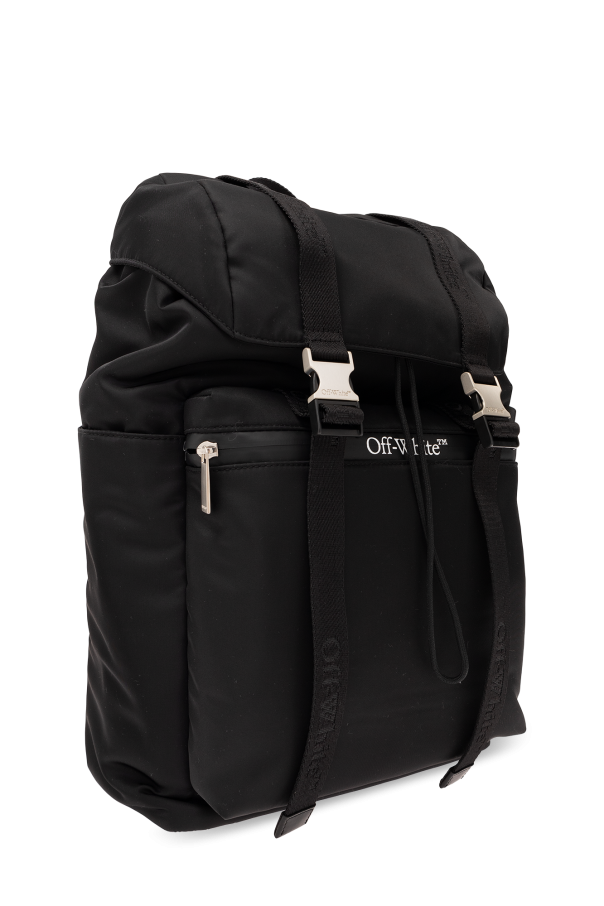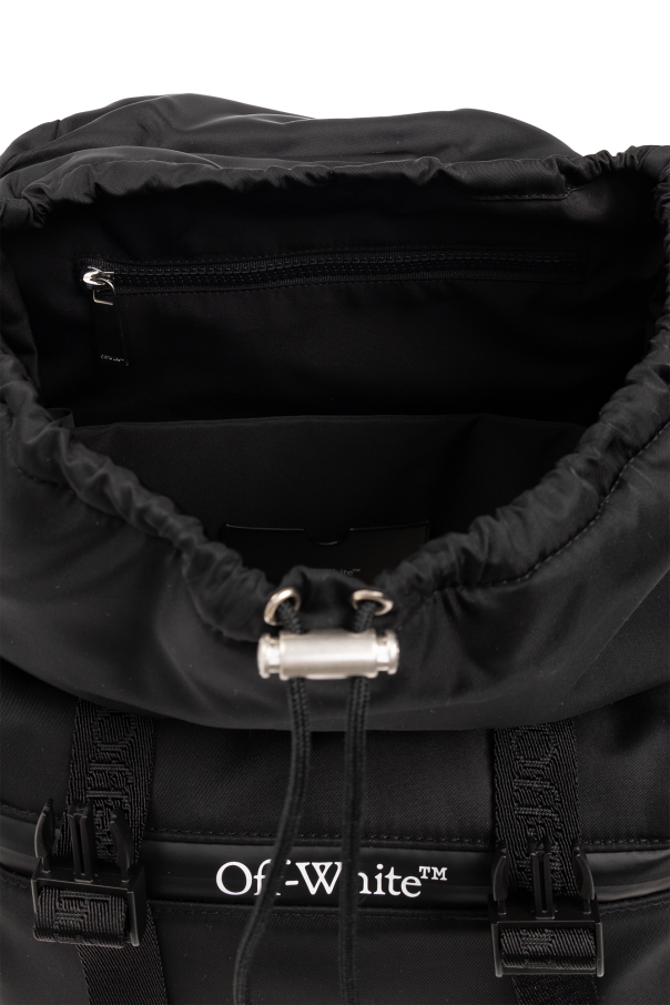 Black backpack from Off-White. Made from nylon, this design cinches closed with drawstrings and showcases a white logo on the front, snap closures, two zip pockets, two slip pockets, one half-round handle, adjustable shoulder straps, silver-tone metal hardware and one internal compartment with one zip pocket, one slip pocket and one card slot.