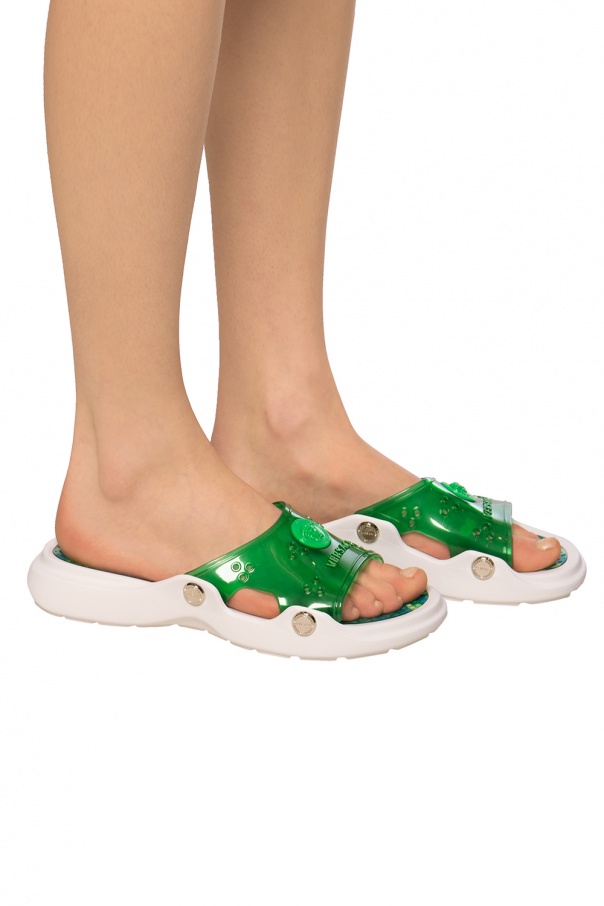Green transparent slides from Versace. Decorated with a raised Medusa head applique and a logo. White rubber sole.