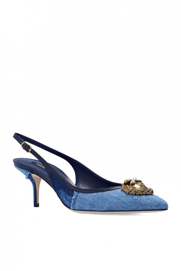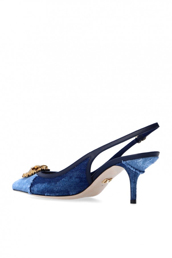 Blue denim stiletto pumps from Dolce & Gabbana. Crafted from leather and fabric, this design features ankle strap fastening, logo appliqué, raw trims and a beige leather sole.