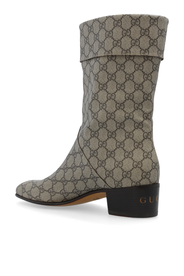 Beige and brown heeled ankle boots from Gucci. Made from ‘GG Supreme’ canvas with an almond-shaped toe and slip-on silhouette, this model sits on a light brown leather sole and features a turn-up hem and gold-tone Gucci lettering at the back.
