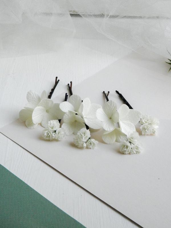 Набор из 7 заколок в прическу с маленькими цветами гипсофиллы и цветами гортензии придаст вашему образу нежности и очарования. Идеально подойдут для праздничной, вечерней причесок, фотосессии.