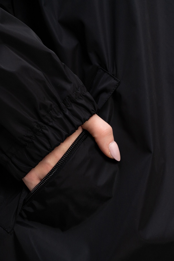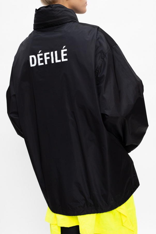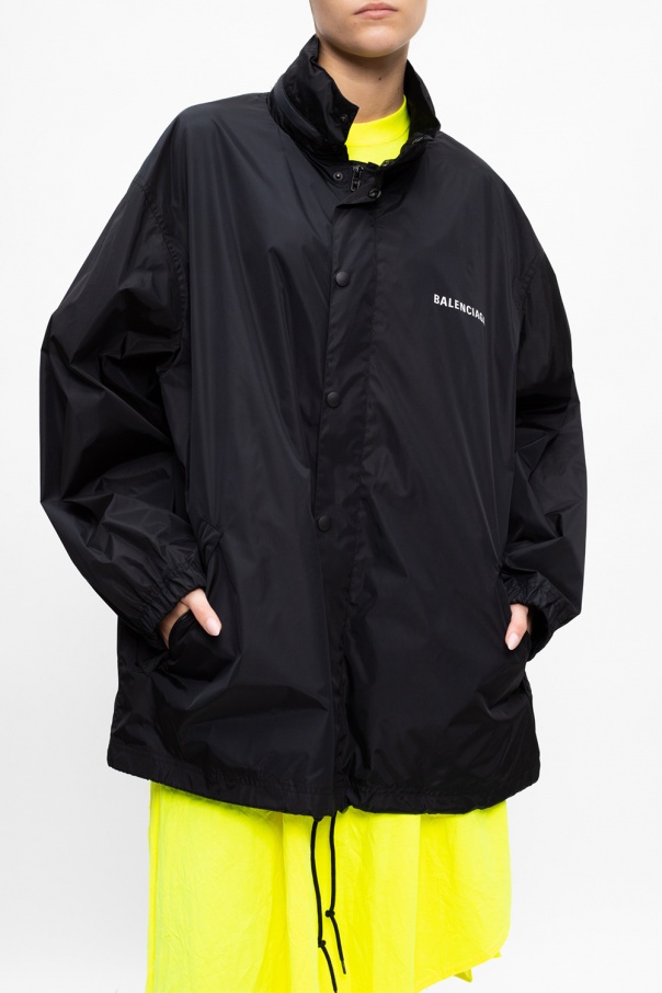 Black jacket from Balenciaga. Printed with the brand\'s logo in white on both front and back, this style fastens via zip and snap-buttons and employs a hood which hides in the collar, two zipped pockets and a drawcord-adjustable hem.