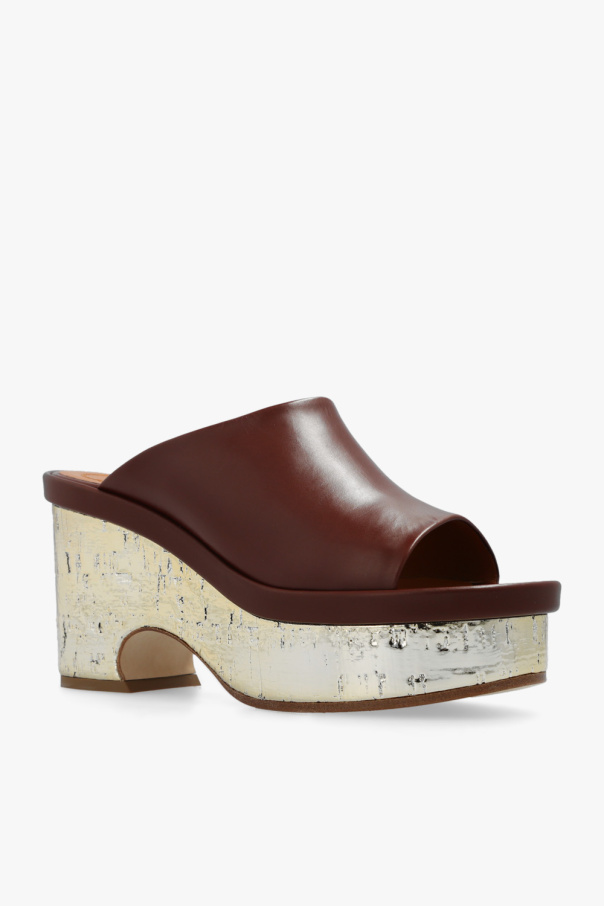 Brown ‘Oli’ platform mules from Chloé. Made of smooth leather, this design features a silver-tone, textured platform and heel as well as a light beige rubber-trimmed outsole.