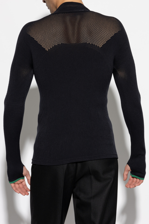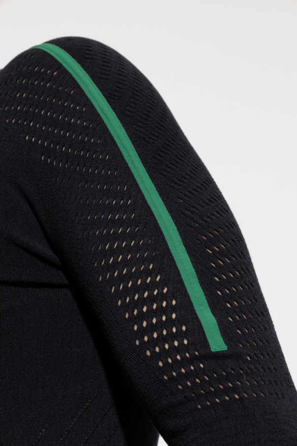 Introducing the Logo Top by Lacoste – a paragon of sophistication and contemporary design. This exclusive piece, part of our esteemed men\'s collection, epitomizes modern elegance and functionality. The top boasts a dominant black hue, meticulously crafted from a blend of wool, polyamide, and elastane, ensuring a supple, body-conforming fit. The fabric\'s stretchability allows for unparalleled comfort and flexibility. Among its distinctive features are the perforated patterns adorning the sleeves and upper back, serving both aesthetic and ventilative purposes. A prominent, perforated crocodile logo graces the front, symbolizing the brand\'s rich heritage. Accentuating the sleeves is a vibrant green stripe that elegantly contrasts the black backdrop, complemented by matching green piping on the cuffs. The long sleeves, equipped with thumbholes, promise additional comfort and stability, enhancing the garment\'s ergonomic appeal. Designed to contour the body, this top not only highlights your physique but also offers a refined look suitable for various occasions. Why Choose This Product? Exclusive design from the renowned Lacoste brand. Luxurious blend of materials for optimal comfort and fit. Elegant perforated details and green accents for a unique look. Functional thumbholes for added stability and ease. Timeless black color, perfect for versatile styling.