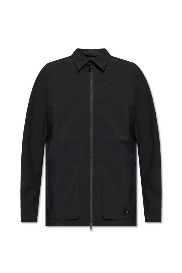 Black jacket from Y-3 Yohji Yamamoto. Crafted from a blend of wool and recycled material, this style fastens with a two-way zipper and button and showcases a rubber logo patch. It is complete with a collared neckline, two slip pockets, zip vents on the bottom sides and long sleeves with button cuffs.