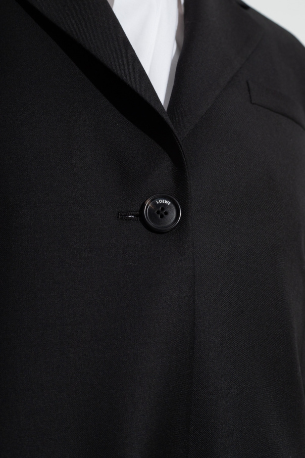 Black blazer from Loewe. Crafted in wool twill, this style fastens with buttons and features a split back with ties, notch lapels, one welt pocket, two flapped pockets and long sleeves with button cuffs.