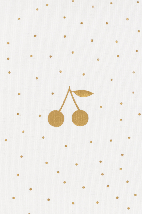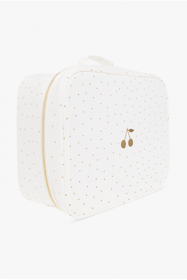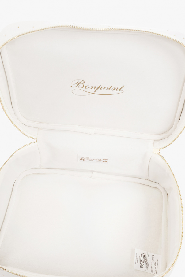 White carry case from Bonpoint. Made from cotton, this item showcases a polka dot pattern accompanied by a gold-tone print with the brand\'s signature cherry. It is complete with a zip-around fastening, a half-round handle and one internal compartment.