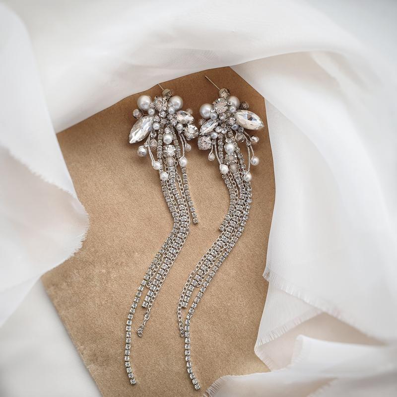 Длинные серебристые серьги, изготовлены из страз, хрустальных и жемчужных бусин, стразовой цепи.