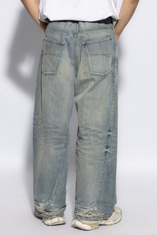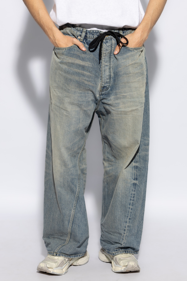 Introducing the epitome of vintage sophistication - Balenciaga\'s Wide-Leg Jeans. Crafted from premium 100% cotton, these jeans merge the timeless allure of classic denim with a contemporary twist. The dominant blue hue, accentuated by a distinctive faded and distressed finish, encapsulates a chic, vintage aesthetic. The design boasts a traditional five-pocket configuration, comprising three front pockets (two side and one small pocket) and two patch pockets at the back. The jeans are further enhanced by contrasting orange stitching, a hallmark of quality denim, and reinforced with metal rivets at the pockets for added durability. Unlike conventional fastenings, these jeans feature a modern, black drawstring belt, offering a casual yet stylish means to adjust the waist for a perfect fit. With their wide-leg silhouette, these jeans provide a relaxed and flattering fit, ensuring comfort without compromising on style. The various angles captured in the photographs showcase the jeans\' exceptional craftsmanship and the attention to detail, from the intricate stitching to the robust material. Why Purchase This Product? Vintage Charm: Faded and distressed finish for an effortlessly stylish, vintage look. Exceptional Craftsmanship: Premium 100% cotton denim, contrasting stitching, and durable rivets reflect high-quality construction. Modern Features: Unique drawstring waistband offers a contemporary twist on the classic jeans design. Versatile Style: Wide-leg fit ensures comfort while remaining fashion-forward.