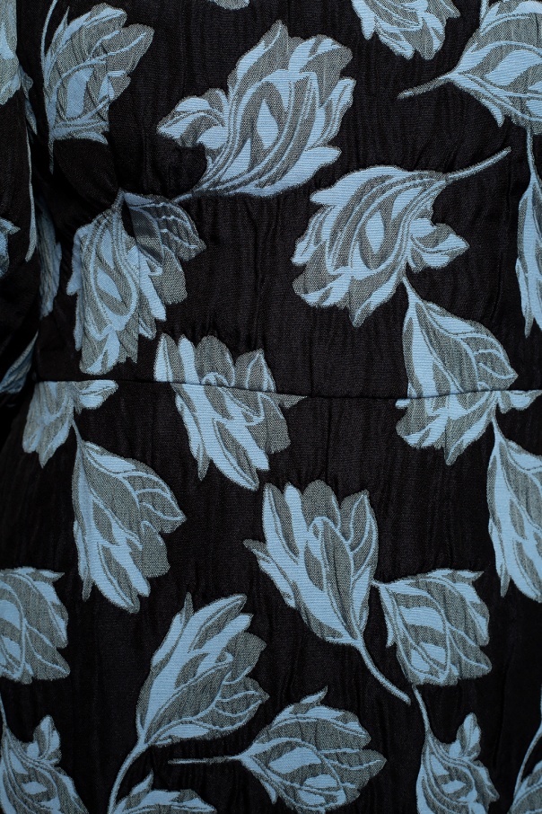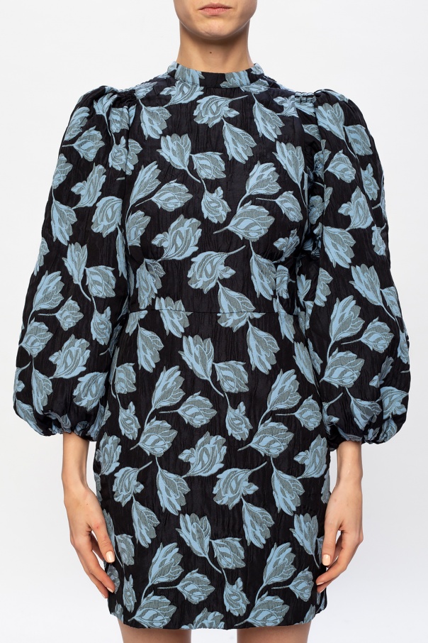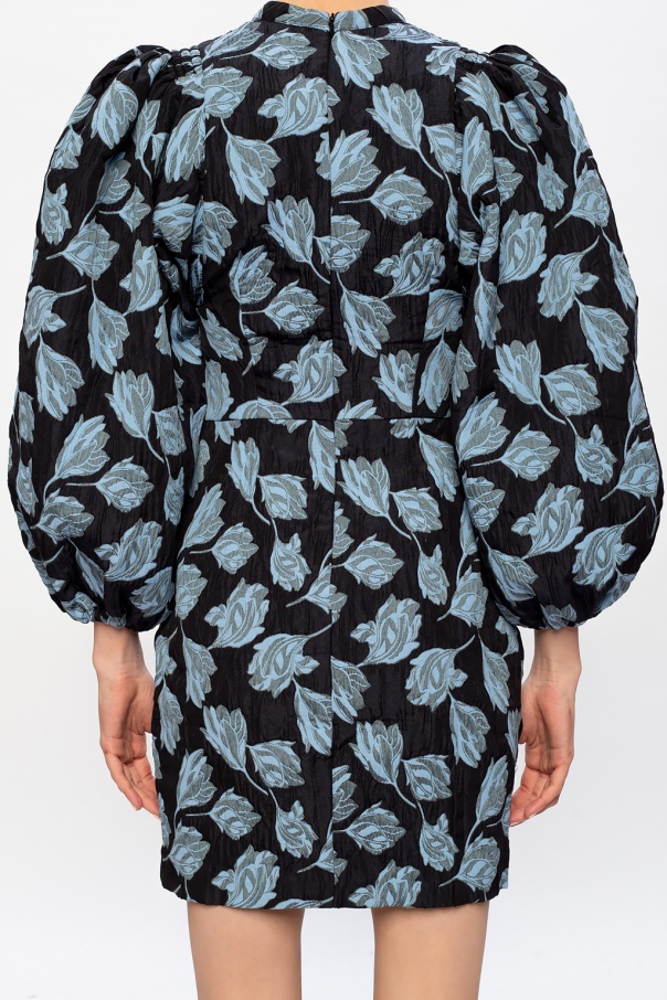 Black dress from Samsoe Samsoe. Crafted in jacquard fabric with blue and grey floral graphic all over, this garment features short length, back zip fastening and voluminous puff sleeves.