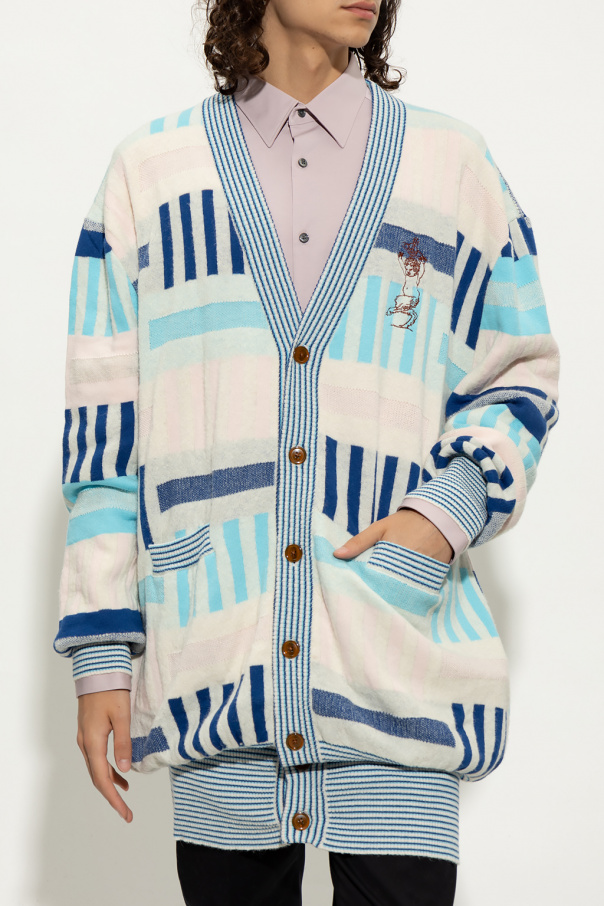 Long, multicolored cardigan from Vivienne Westwood. Crafted from alpaca wool, this garment features brown buttons, stripe pattern, embroidered faun and logo pattern in brown, two front pockets and ribbed trims at the hem and cuffs.