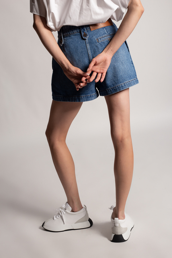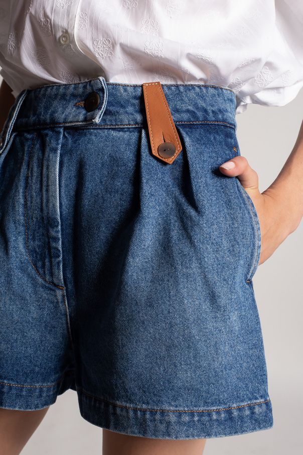 Blue shorts from Loewe. Fastened with a zip and button, this pair features a brown logo-embossed patch, two front pockets and one zipped back pocket.