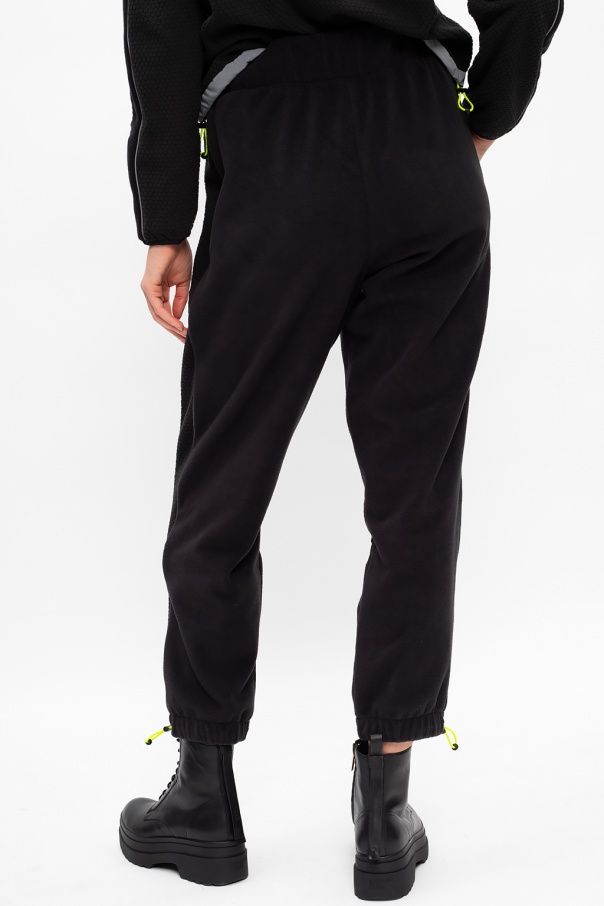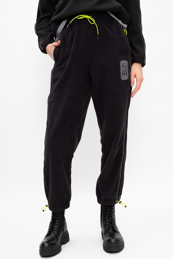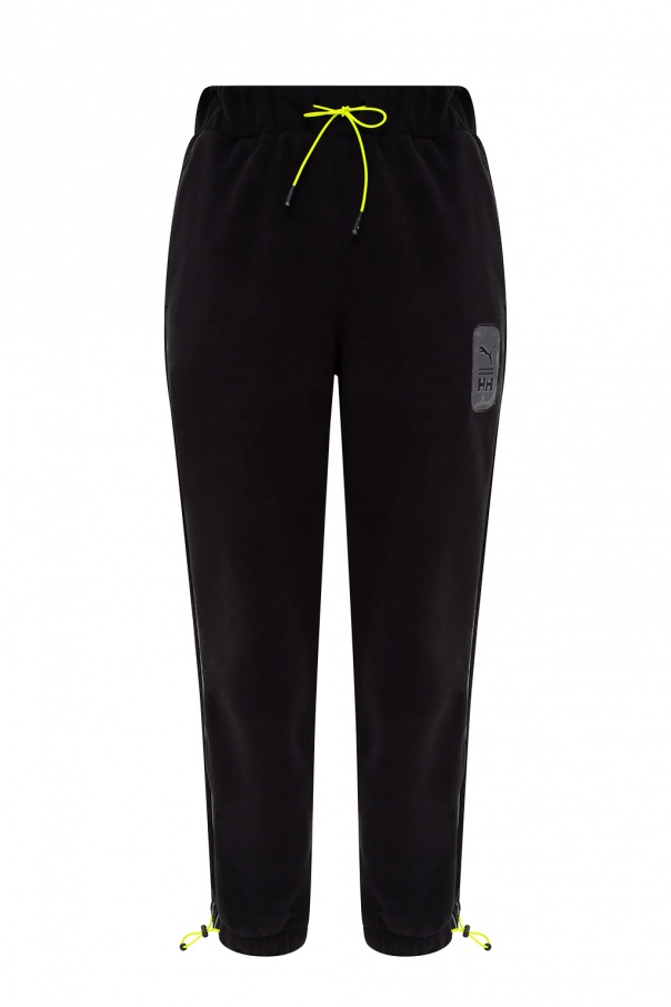 Black trousers from Puma x Helly Hansen. Crafted from fleece, this design features neon yellow drawstrings, logo-embossed patch, silver-tone reflective elements, two slip pockets and elasticated cuffs.