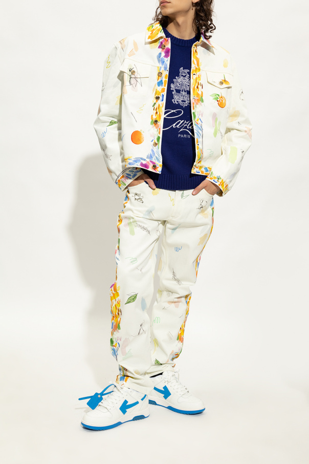 White and blue ‘Out Of Office’ sneakers from Off-White. Crafted from leather, this lace-up pair features an Arrows patch, perforations, the brand’s signature zip tie in blue and rubber sole in white and blue.