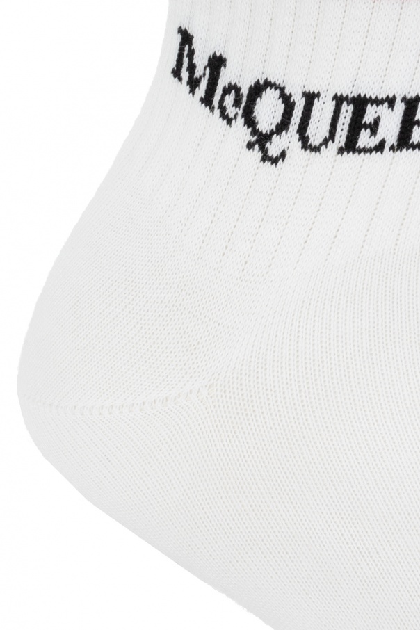 White ribbed socks from Alexander McQueen. Crafted from cotton, this design is enriched with an embroidered logo pattern in black and red.