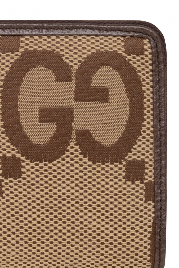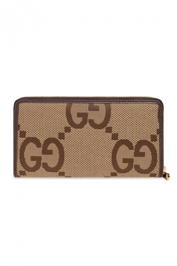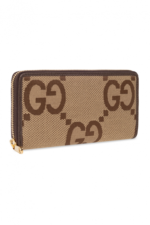 Beige and brown wallet from Gucci. Crafted from a cotton blend and trimmed with leather, this design secures with a zip and showcases the brand's Jumbo GG pattern, gold-tone metal hardware and three bill compartments, one zip coin pocket and twelve card slots inside.