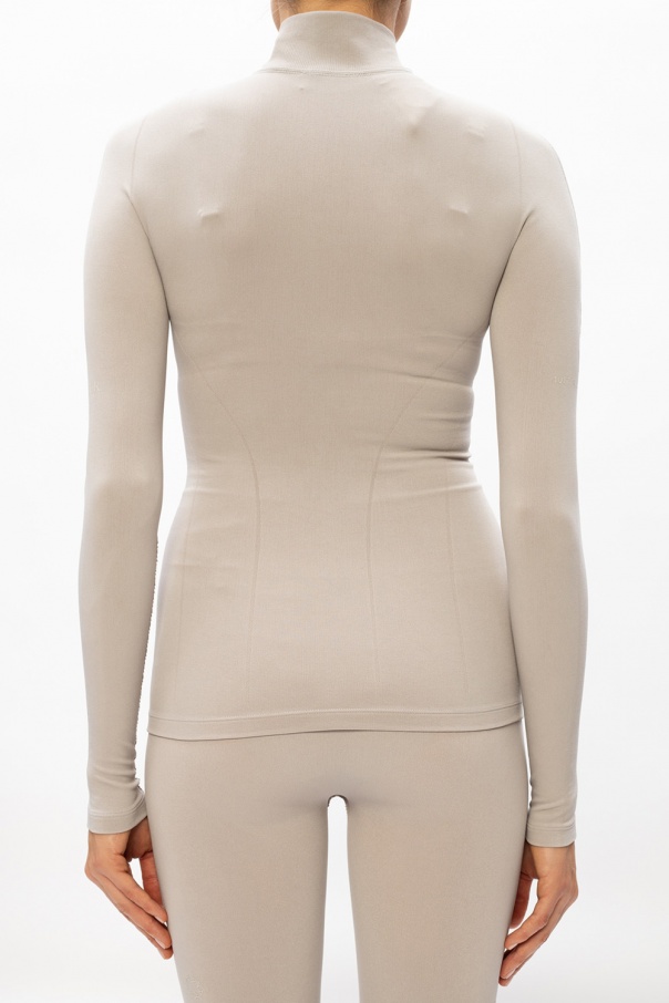 Light grey turtleneck sweater from Moncler Genius, the ‘1017 ALYX 9SM no.6’ collection. Fastened with a zip, this garment features a beige logo print and decorative stitching details with a raw trim.