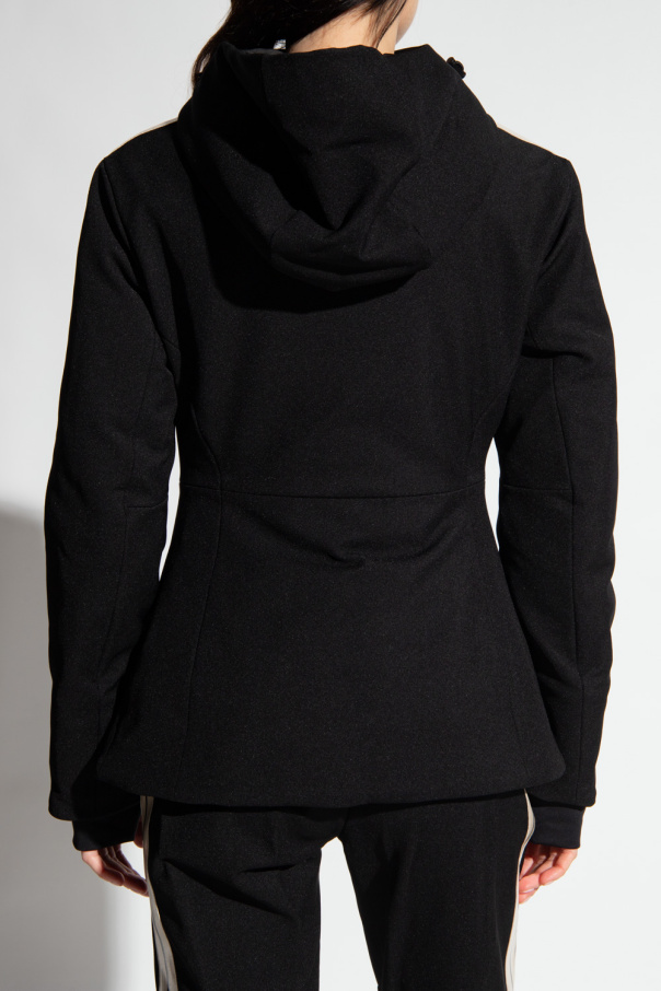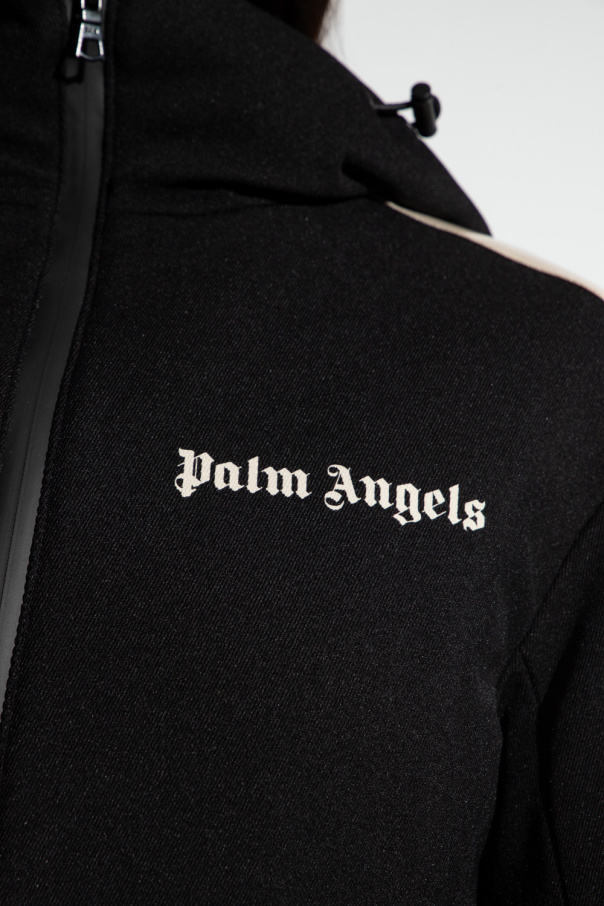 Black and cream ski jacket from Palm Angels. Printed with the brand\'s logo, this style features a zip fastening, a drawstring hood, three zip pockets, including a ski pass pocket on the sleeve, and elasticated cuffs with thumbholes.