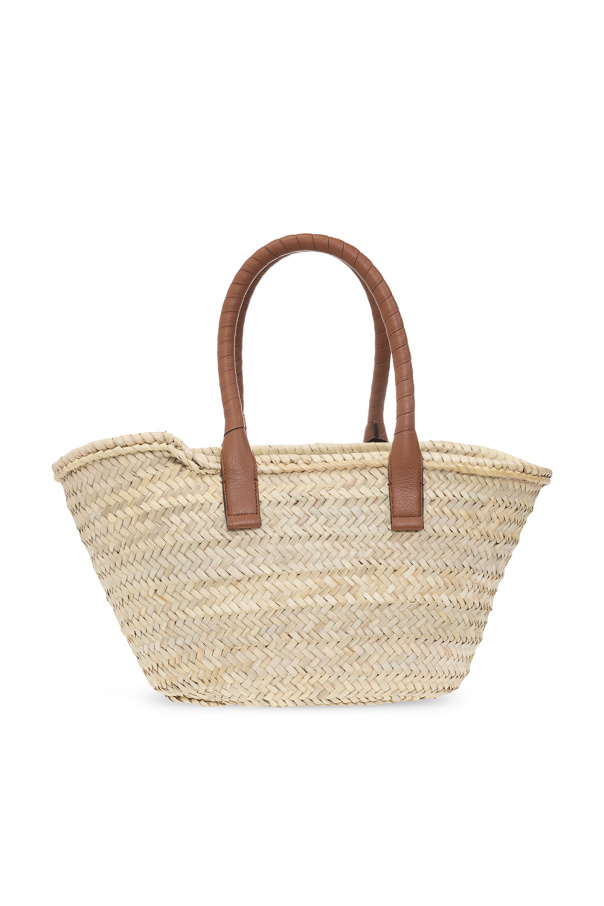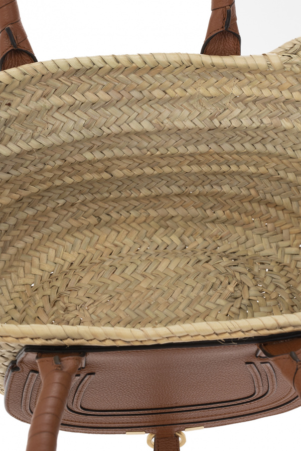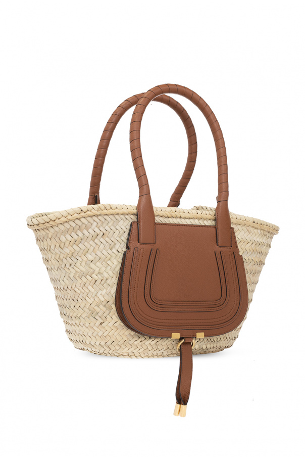 Beige and brown ‘Marcie Medium’ shopper bag from Chloé. Made of woven raffia with calf leather trims, this model features a front pocket with a decorative closure, decorative stitching details, embossed logo, two half-round handles, one internal compartment and gold-tone metal hardware.