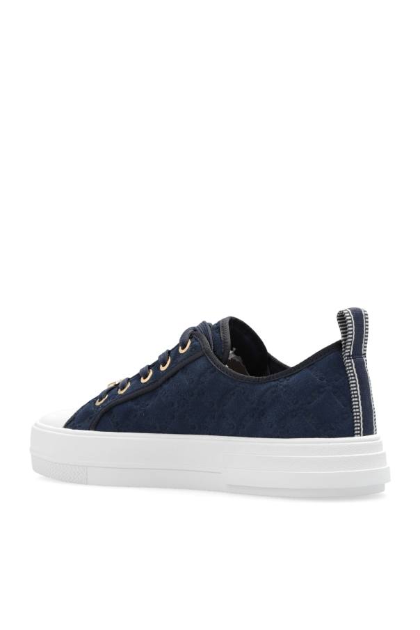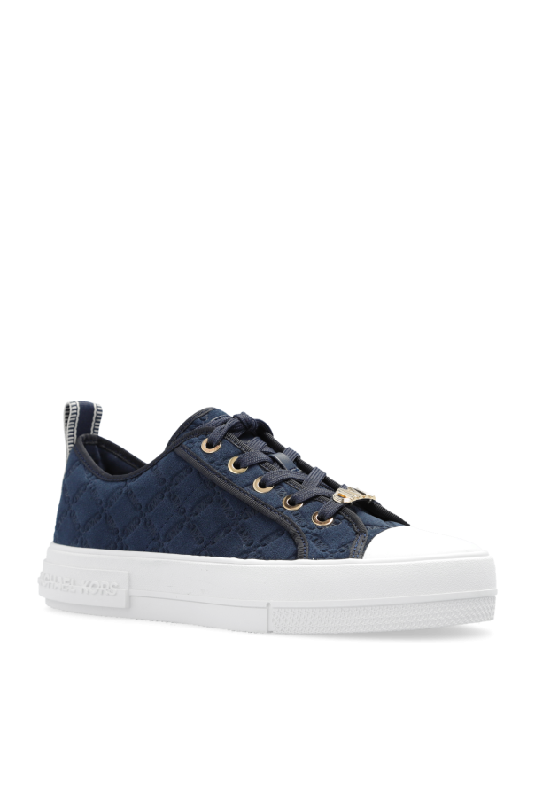 Navy blue ‘Evy’ sneakers from Michael Michael Kors. Made of suede, this lace-up model sits on a white rubber sole and showcases an embossed monogram pattern and gold-tone logo hardware on the front.