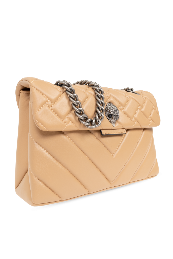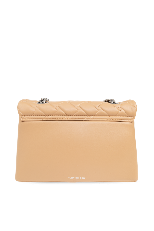 Introducing the \"Kensylvania Shoulder Bag\" by the esteemed designer Kurt Geiger, a piece where luxury meets utility in a harmonious blend. Crafted with precision, this bag showcases a classic rectangular silhouette with softly rounded corners and a sophisticated folded flap, enveloping one\'s essentials in elegance. The exterior is adorned with intricate V-shaped quilting, adding a layer of refinement and texture. The choice of high-quality leather gives the bag its smooth texture and uniform beige color, exuding an air of polished sophistication. Metal accents, including the designer\'s shield logo and the silver chain strap, introduce a contrast that is both luxurious and stylish, enhancing the bag\'s overall allure. Functionality is not compromised, as evidenced by the interior\'s thoughtful design featuring a zippered compartment, additional pockets for organization, and a convenient magnetic snap closure. Whether showcased in use or observed from various angles, the \"Kensylvania Shoulder Bag\" stands out for its size, how it gracefully complements the wearer, and its meticulous attention to detail. Why Purchase This Product? Exquisite craftsmanship and high-quality materials. Unique V-shaped quilting and metal accents for a touch of glamour. Versatile beige hue, perfect for a myriad of styling options. Designed with practicality in mind, featuring multiple compartments and pockets.