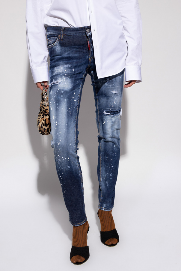 Navy blue ‘Jennifer’ jeans from Dsquared2. Cut with a low-waisted silhouette, this pair features button fastenings, the brand\'s signature paint splatters and distressed effects, and classic five pockets.