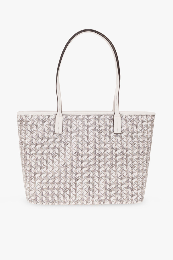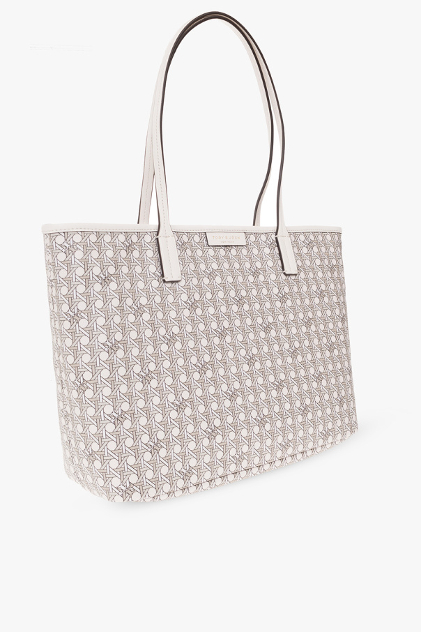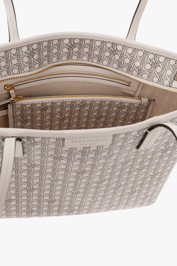 Cream ‘Basketweave Small’ shopper bag from Tory Burch. Crafted from coated canvas with a basketweave-inspired pattern in beige and grey, this design secures with a zipper and features a logo-printed patch on the front, two half-round handles, gold-tone metal hardware and one internal compartment with a zip pocket and a detachable zip pouch.