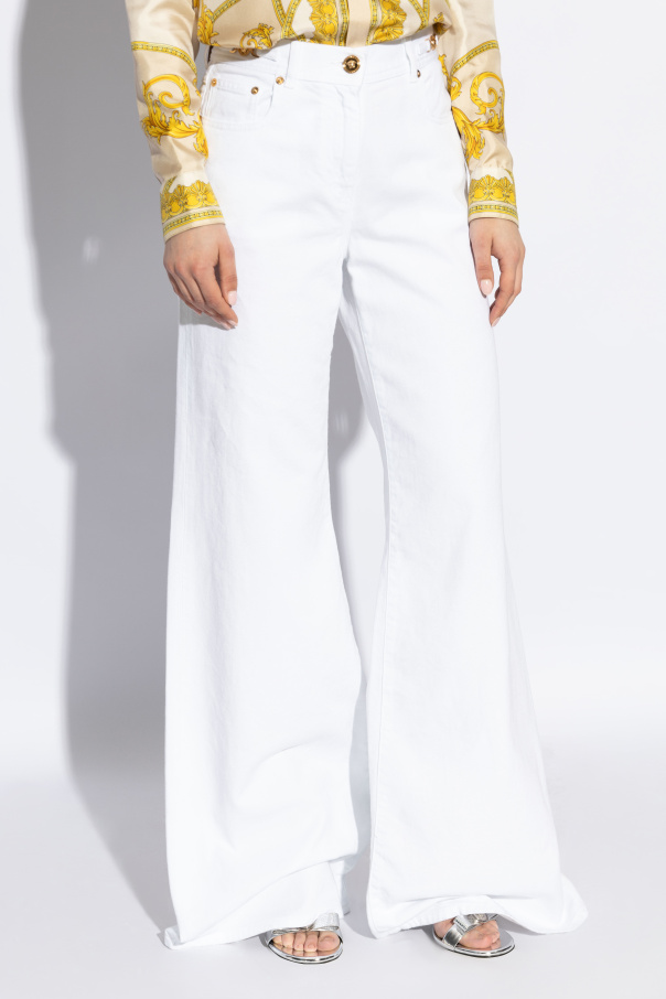 Introducing the epitome of sartorial elegance and timeless design, the Versace High-Waisted Flare Jeans. Crafted from 100% premium cotton, these exquisite white jeans blend classic sophistication with contemporary flair. The jeans feature a flattering high waist, seamless zip and button closure adorned with distinctive gold-toned buttons, signifying the luxurious essence and exceptional craftsmanship synonymous with the Versace brand. Designed to accentuate and elongate the silhouette, the jeans gracefully fit at the waist and hips before flaring from the knee to create the iconic bell-bottom shape. The rear of these jeans remains elegantly unadorned, save for symmetrically placed, classic pockets, ensuring a sleek and polished look. A signature brown leather patch bearing the embossed Versace logo adds a final touch of exclusivity, identifying these jeans as a must-have item from an elite fashion collection. Why Purchase These Versace Flare Jeans? Exclusive Design: Stand out with the unique bell-bottom style that combines modern luxury with retro charm. Premium Materials: Enjoy the unparalleled comfort and durability of 100% cotton, ensuring these jeans remain a staple in your wardrobe. Signature Versace Aesthetics: Embellished with gold-toned buttons and a distinctive leather logo patch, these jeans are a testament to Versace\'s legacy of luxury. Versatile Elegance: Perfect for a variety of occasions, these jeans can be dressed up with heels and a blazer or dressed down with sneakers and a casual tee.