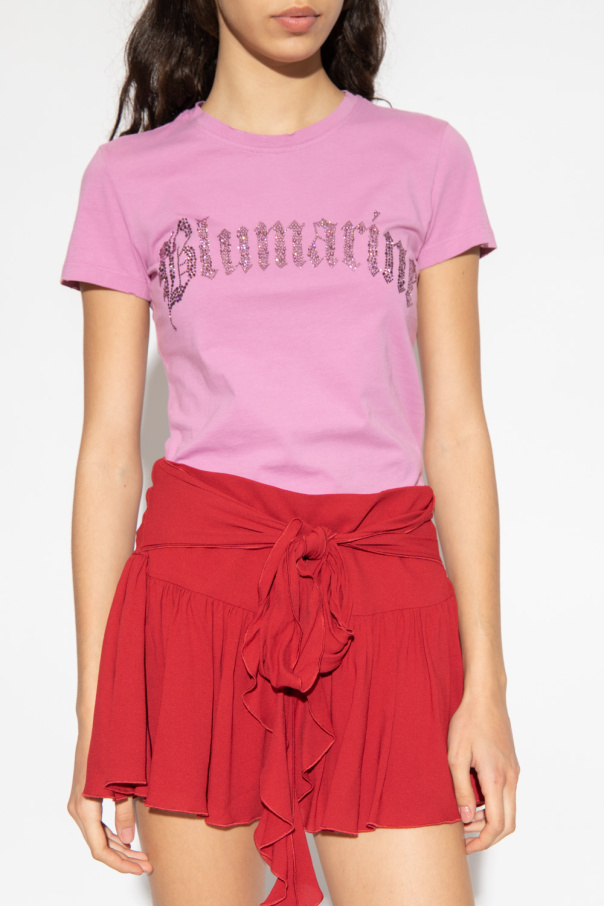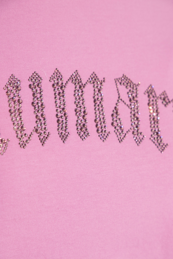Pink T-shirt from Blumarine. Crafted from cotton, this short sleeve design features a logo appliqué embellished with crystals and ribbed crew neck with a vintage effect.