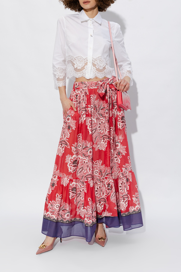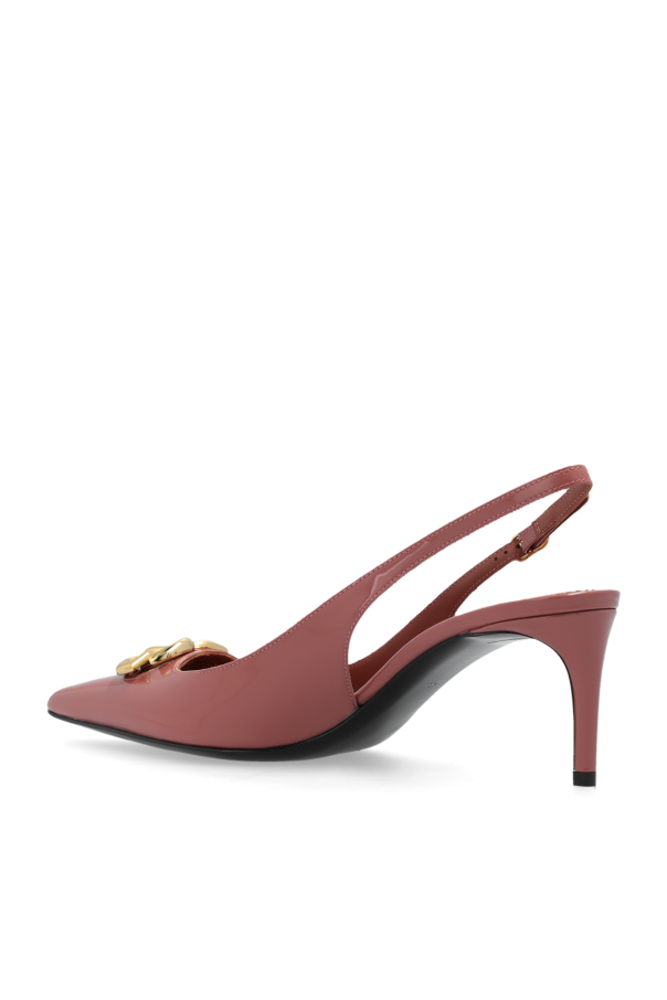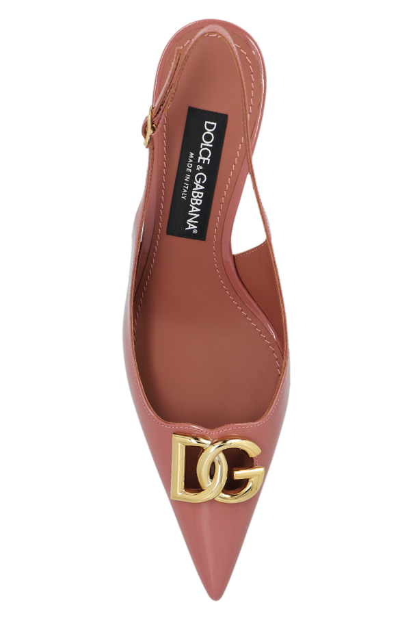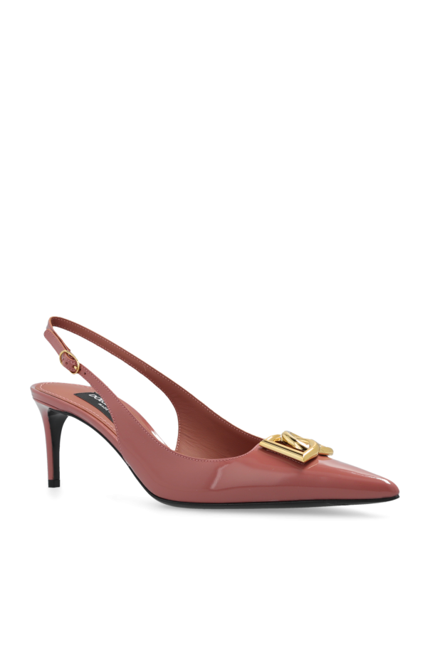 Blush pink pumps from Dolce & Gabbana. Made of polished leather with a pointed-toe silhouette, this model sits on a black leather sole and features an adjustable buckle strap, gold-tone logo hardware with cutouts on the front and an open heel.
