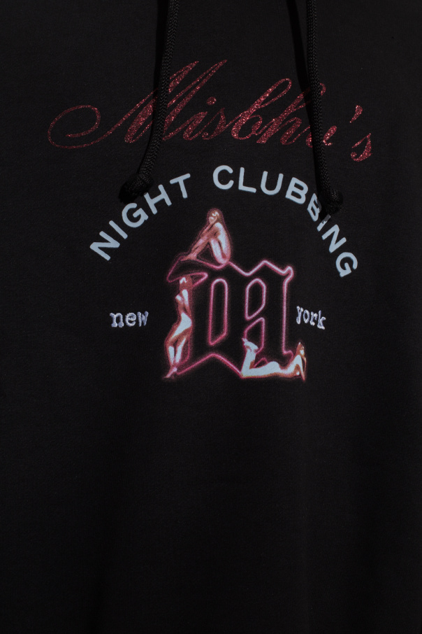 Black ‘Night Clubbing’ hoodie from MISBHV, the ‘Metamorphosis 1993’ collection. This garment features a printed and embroidered logo pattern, drawstring hood, vintage effect and ribbed trims at the hem and cuffs.