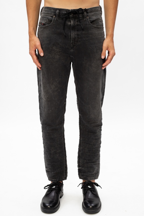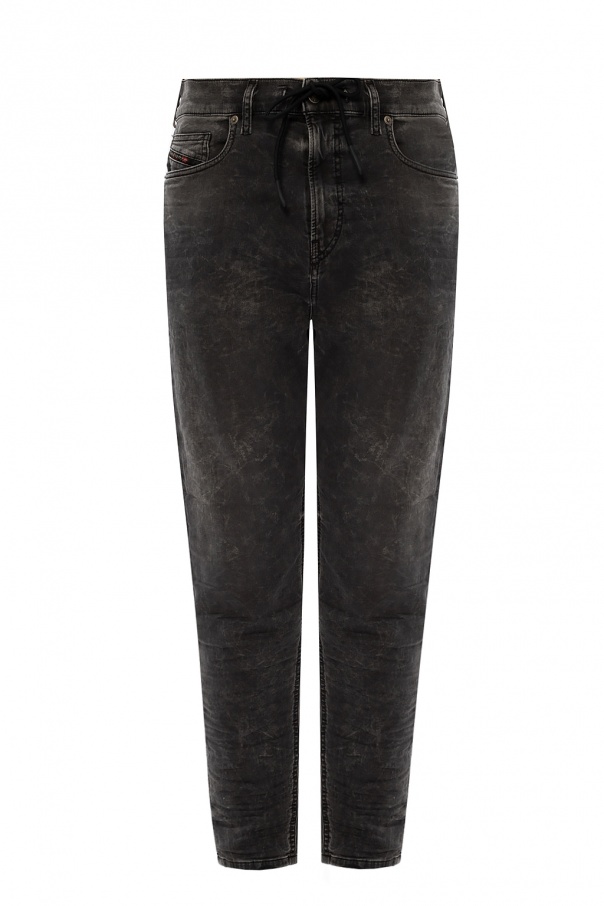 Dark grey ‘D-Vider Jogg’ jeans from Diesel. This model features button, zip and cord fastening, a logo-embossed patch in black, distressed details and five slip pockets.