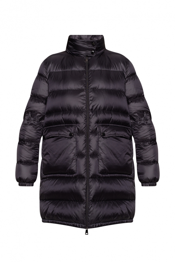 Dark grey quilted down jacket from Moncler. Fastened with a two-way zip and snaps, this design features a cream, navy and red logo patch, two snap-fastened flap pockets, concealed hood and long sleeves with ribbed cuffs.