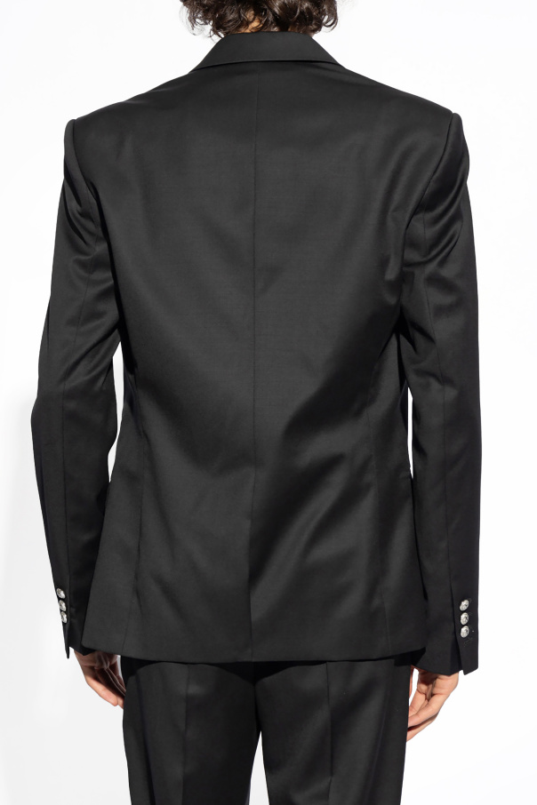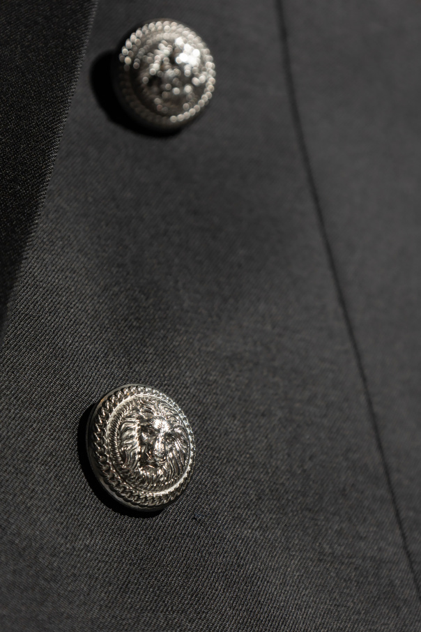Introducing the epitome of sartorial elegance: the Wool Blazer from the distinguished house of Balmain. Crafted with meticulous attention to detail, this exquisite piece showcases a smooth, high-quality wool fabric, rendering it a paragon of luxury and comfort. The blazer features a classic, single-breasted design that is both timeless and sophisticated, accentuated by a unique round neckline that sets it apart from conventional styles. The front of the blazer is adorned with six silver, ornamental buttons, arranged in two parallel rows, each bearing the designer\'s logo engraved with precision, adding a touch of exclusivity and charm. The silhouette is elegantly structured, with slightly emphasized shoulders that enhance its refined appearance. Practicality is woven into its design with three pockets: two flap pockets on the sides and a sleek welt pocket at the chest, blending functionality with fashion. The back of the blazer remains smooth, featuring a single vent for increased mobility, a hallmark of classic men\'s tailoring. Cuffs are meticulously finished with smaller buttons, maintaining consistency with the blazer\'s front and adding a cohesive touch to its overall design. Why Purchase This Product? Exclusive design from the renowned Balmain collection, ensuring a distinctive, high-fashion look. Made from 100% premium wool, offering unparalleled comfort and durability. Elegant details, including engraved decorative buttons, elevate your wardrobe with a piece that\'s both stylish and timeless. Versatile functionality with three pockets for essentials, combining convenience with high style. Classic cut with a modern twist, thanks to its round neckline and structured silhouette, making it a unique addition to any discerning gentleman\'s collection.