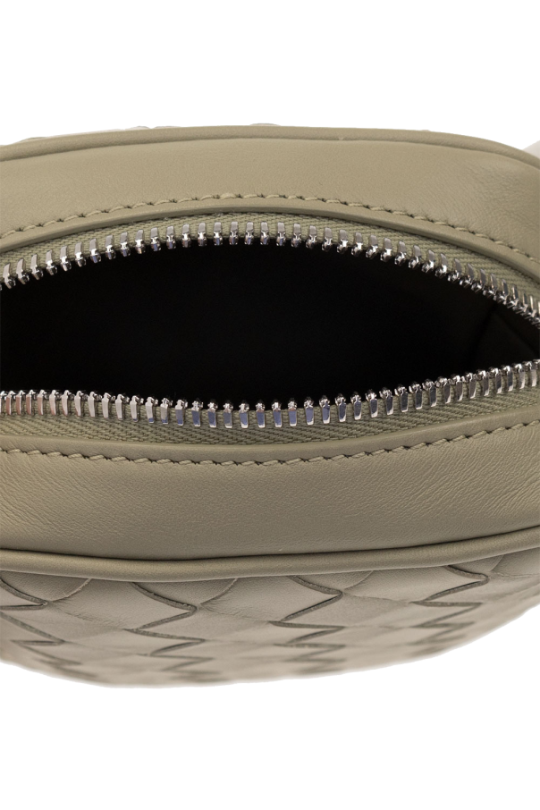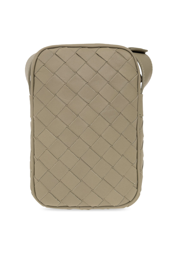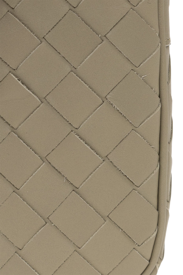 Greyish green phone holder from Bottega Veneta. Crafted from calf leather with the brand\'s signature ‘Intrecciato’ weave, this design fastens with a zip and features an adjustable shoulder strap and three card slots inside.