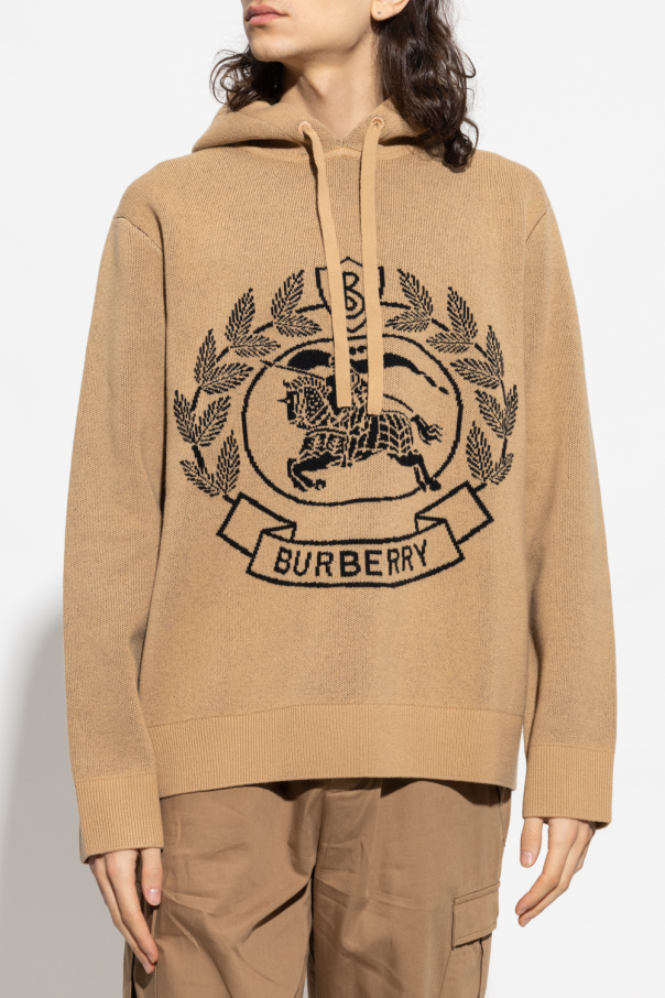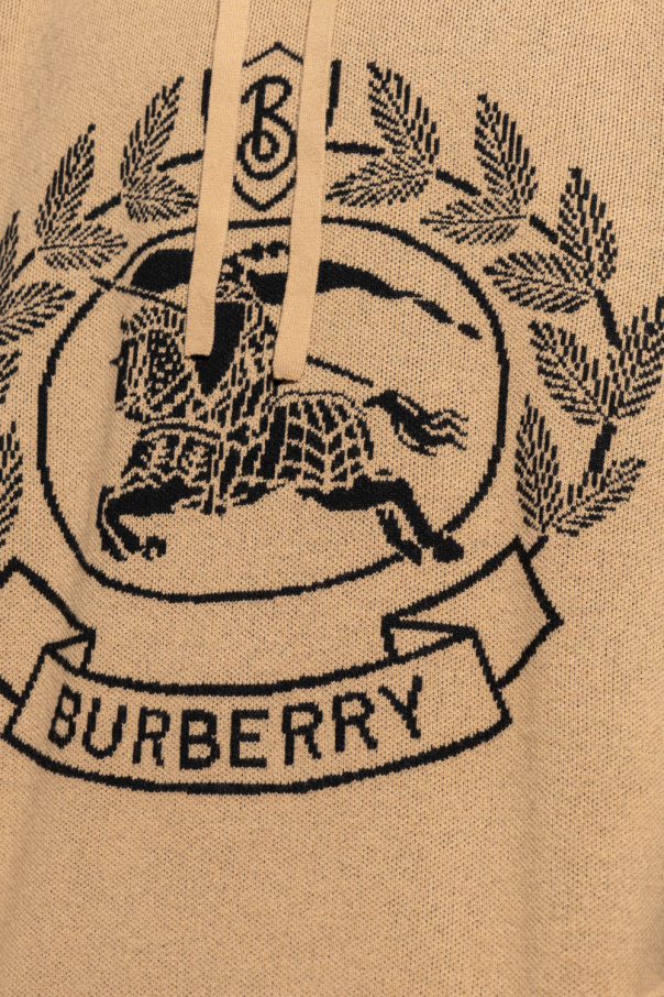 Beige ‘Orlando’ sweater from Burberry. Made of wool, this garment features a drawstring hood, decorative embroidered logo pattern in black and ribbed trims at the hem and cuffs.